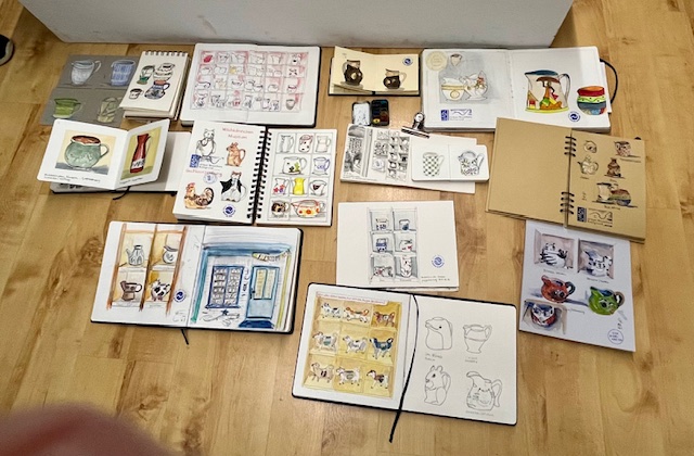 Eine Gruppe von Malerinnen und Malern, die regelmäßig zusammen zeichnen und malen, hat sich am Sonntag, den 18. Januar im Milchkännchen-Museum getroffen. Nach einer kurzen Besichtigung füllte sich das Museum: ausgestattet mit Block und Papier, Stiften, die mit Wasser gefüllt waren, Kreide und Sitzgelegenheiten hatten alle einen Platz gefunden und begannen zu zeichnen und zu malen. Sofort breitete sich eine besondere Atmosphäre im Museum aus: das Geräusch der Stifte auf dem Papier, ein Lachen, ein kurzes Gespräch. Ab und zu wurde ein Milchkännchen umgestellt, um es besser ansehen zu können. Nach zwei Stunden waren die unterschiedlichsten Bilder entstanden, die zu einem gemeinsamen Werk zusammen gelegt wurden.